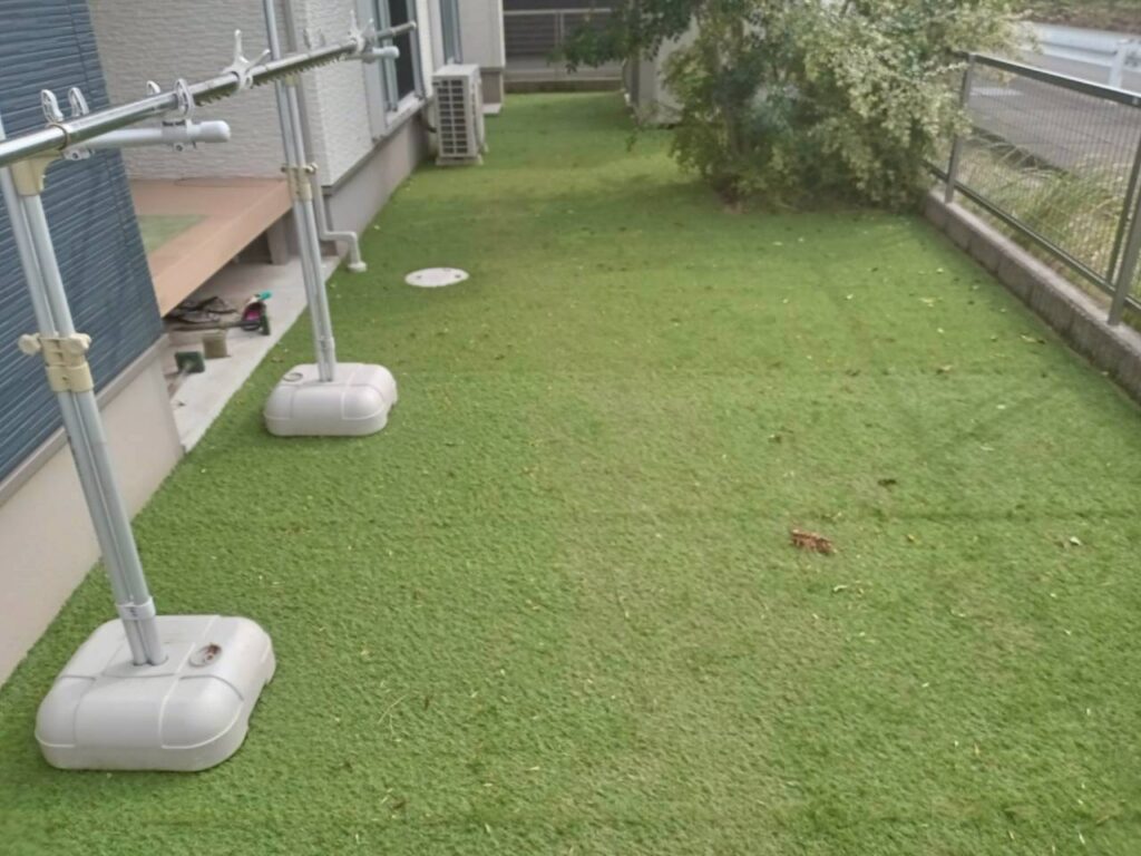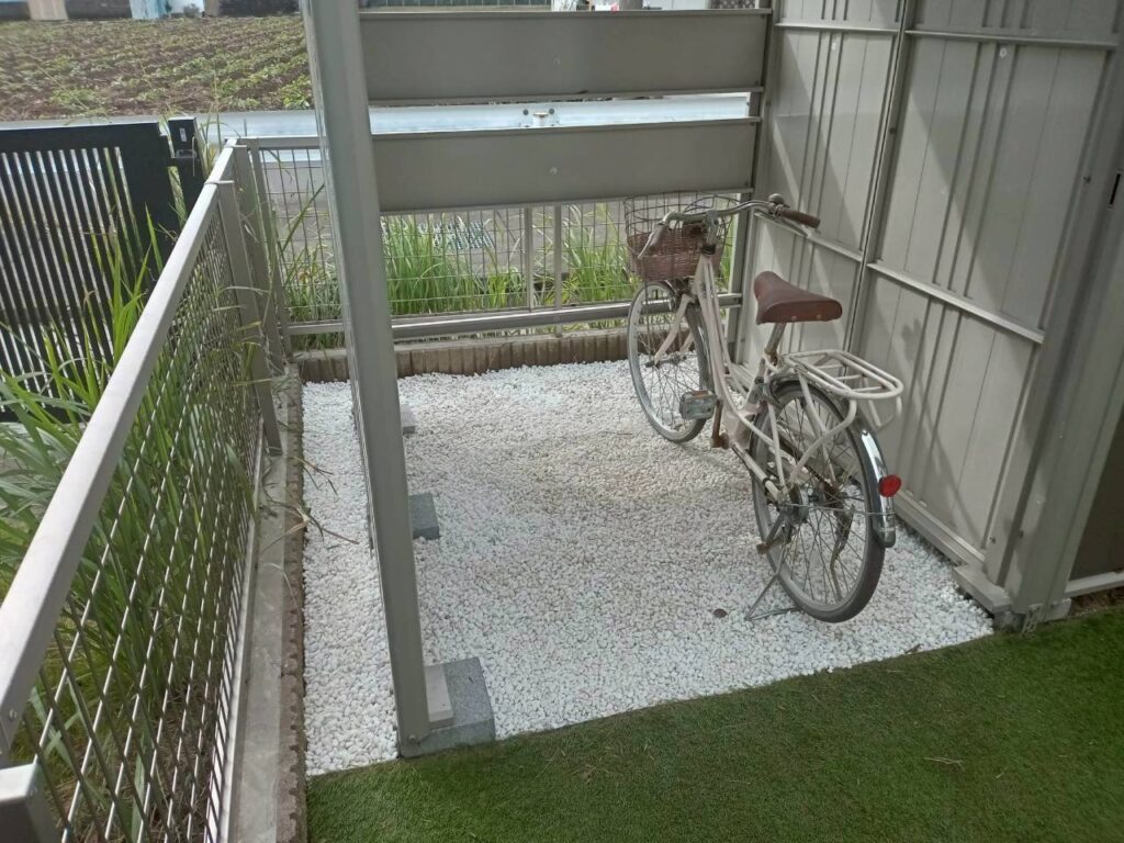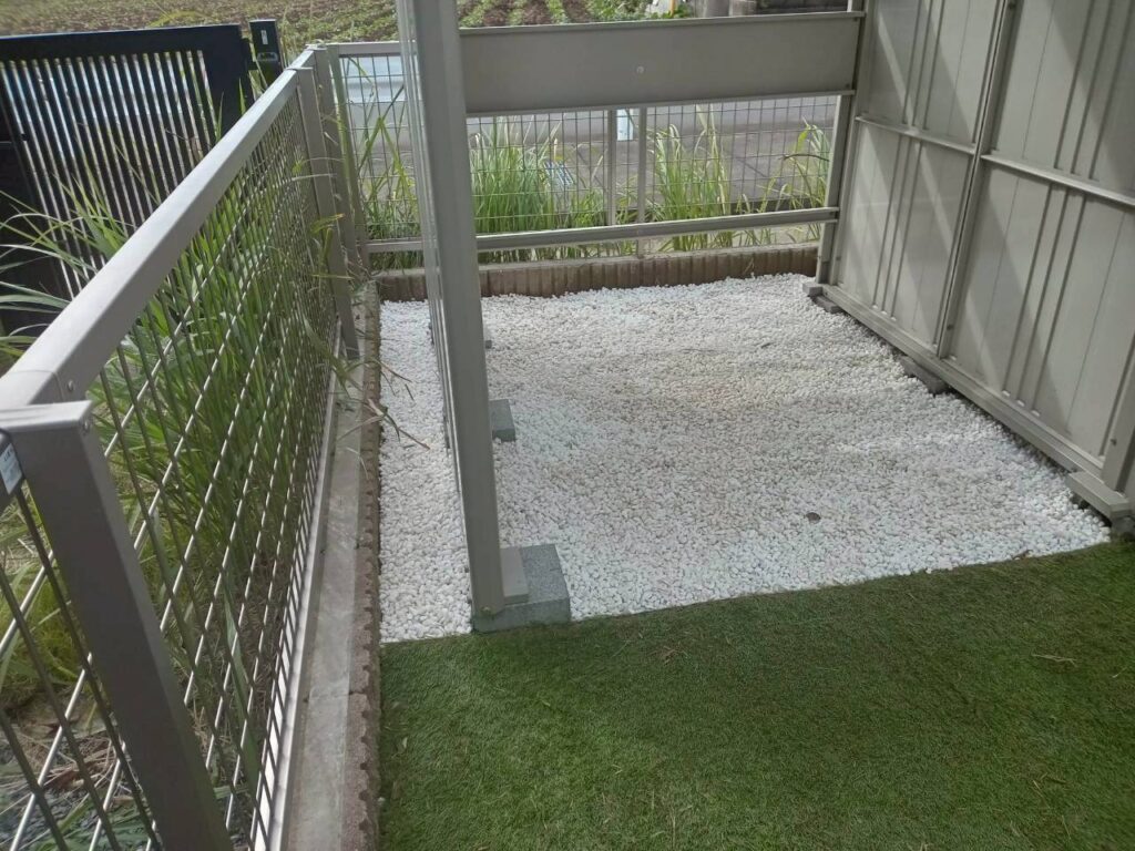 人工芝のお庭に隣接するスペースを整え、自転車置き場として使いやすい砂利敷きスペースを新たに施工しています。